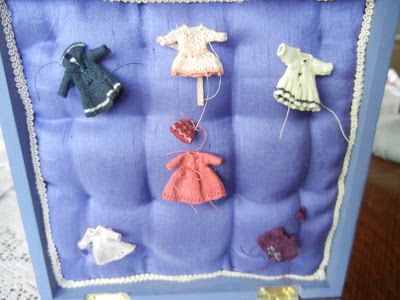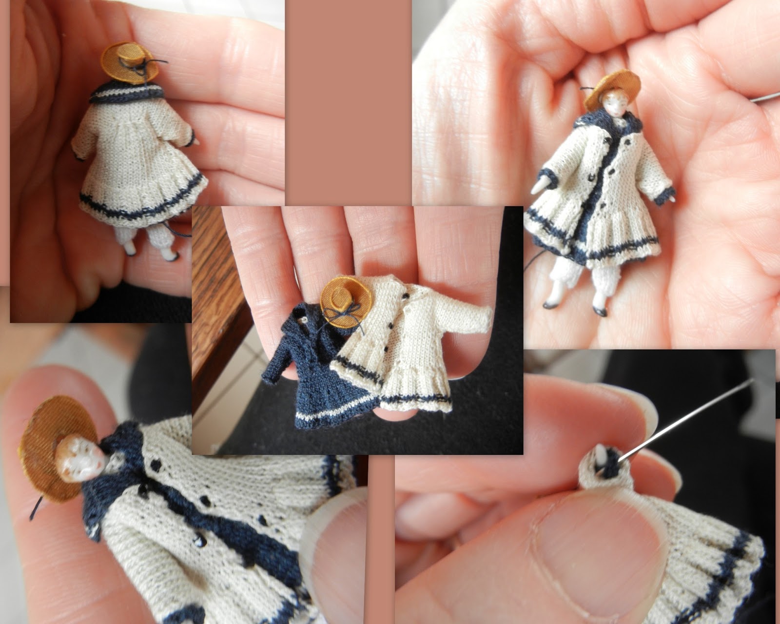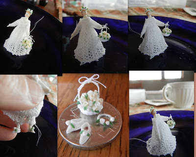 I made some tiny roses with Femo. I glue a thread around the brim of hat...if I was to make a larger hat for a one inch scale doll, I would use a double thread for the spokes and the weaving thread, and I would use a braid to go around the brim. I used my pin cushion to hold the hat down while I attached a little bow to it. The tiny roses are a last touch...I will carefully glaze the roses with triple thick so that they will have more substance.