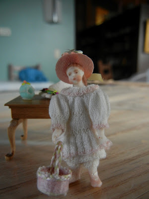 I sculpted Posy Anna out of porcelain and dressed her in hand knit clothing. Her clothes consist of a pair of tiny pantaloons, a slip and a frock. The frock is held together by tiny buttons with real button holes. Her shoes are glued on and are made of pink silk. Her hat is made of silk that I stiffened with glue and then cut into hat shaped pieces and assembled with glue. The tiny feather comes from a love bird I once had named Alfie.